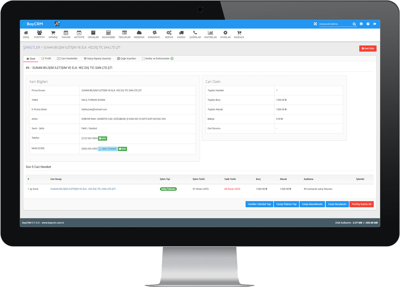 Entegre müşteri portföyü yönetimi, pazarlama ve satış araçları, ön muhasebe ve cari takip, hesap/kasa yönetimi, gelir gider takibi, çek takibi, entegre çağrı merkezi sistemi ve dahası!... Bir işletmenin ihtiyaç duyabileceği tüm özellikler tek bir uygulama altında!